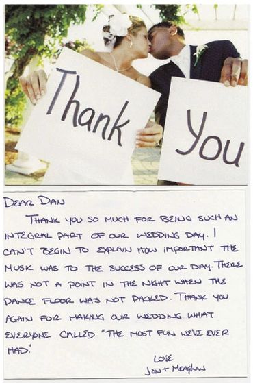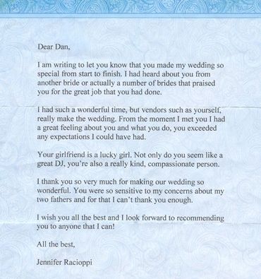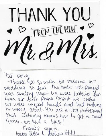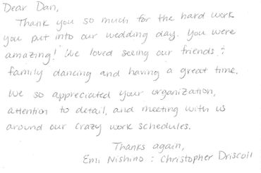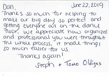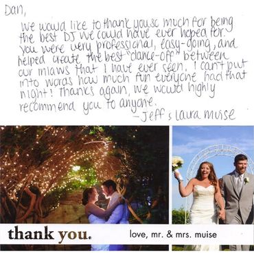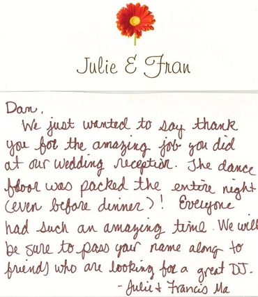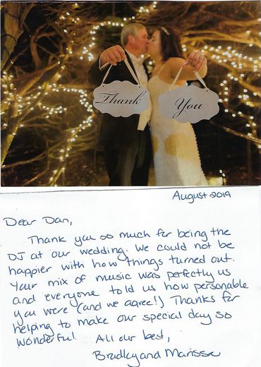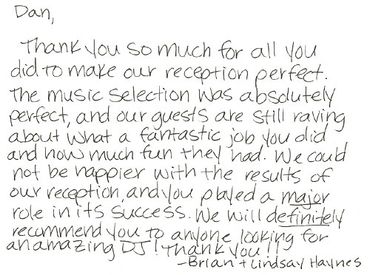 We just wanted to email to thank you for the incredible job you did DJing at our wedding on Sunday. I've never danced so much in my life - it was the BEST time! My dad was even moving and grooving! It was a night to remember.